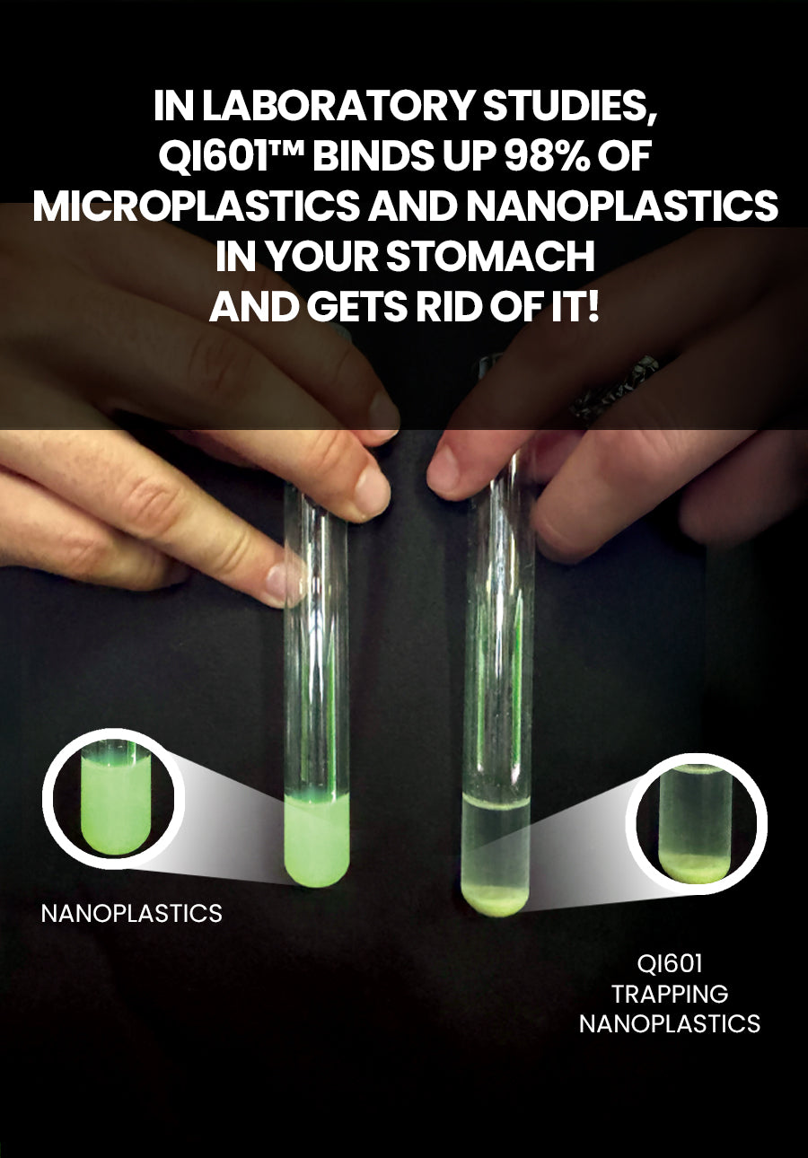 Qi601™ is the world’s first microplastic detox cleanser powered by a probiotic strain—engineered with a breakthrough Biofilm Shield™, a natural, adhesive layer inside your stomach and digestive system that acts like a magnet for microplastics.